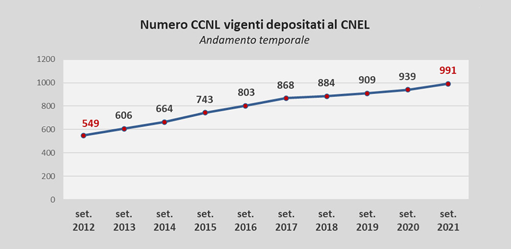 Se analizziamo l’andamento nel tempo del numero dei CCNL censiti, si nota un costante incremento nel corso degli ultimi 10 anni; dai 347 accordi vigenti che risultavano depositati al 1° gennaio 2011[8], il trend di crescita si è mantenuto infatti abbastanza regolare e può ben essere illustrato dalla seguente tabella, tratta dall’ultimo Rapporto CNEL sul mercato del lavoro e della contrattazione collettiva presentato il 21 dicembre 2021[9]: