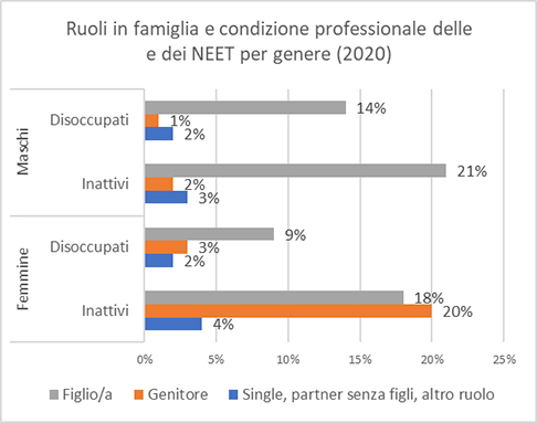 I NEET dai 15 ai 34 anni sono per il 56% donne e per il 44% uomini. Dal 2007 al 2020 la quota di donne è rimasta sempre decisamente alta rispetto a quella degli uomini; inoltre nel tempo, il numero di NEET donne è variato molto di meno. Per una donna, quindi, è molto difficile uscire da questa condizione. Per le donne le percentuali di NEET residenti in ogni Regione partono da un minimo del 45% fino a un massimo del 71%, di molto superiori rispetto a quelle dei maschi, il cui minimo è pari al 29% e il massimo al 54%. Netto, quindi, appare lo svantaggio di genere anche nella dimensione territoriale. Inoltre ci sono più NEET laureati tra le donne (16%) che tra gli uomini (10%). Rispetto alla condizione professionale, le NEET sono principalmente inattive che non cercano lavoro e non sono disponibili (27% sul totale della popolazione NEET). Incrociando le informazioni sui ruoli in famiglia con la condizione professionale, il 20% delle NEET sul totale sono madri inattive, mentre soltanto il 3% sono madri disoccupate (figura 3).